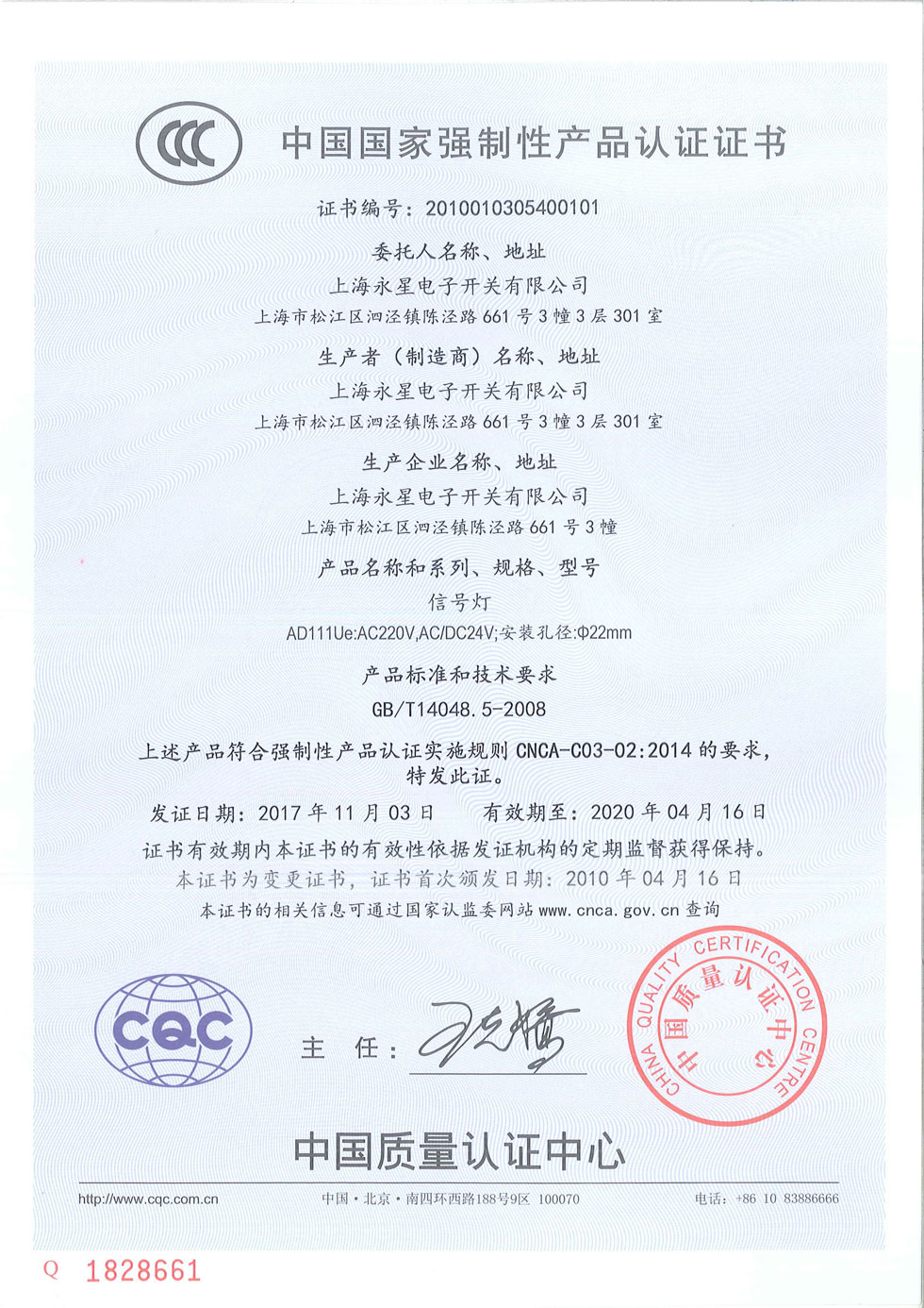 AD111指示燈CCC認證證書