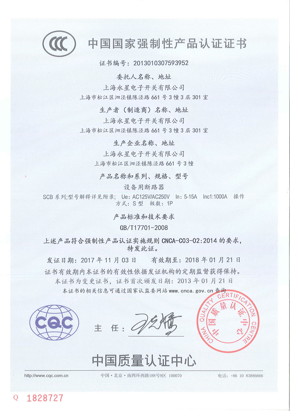 SCB過載保護開關CCC認證證書