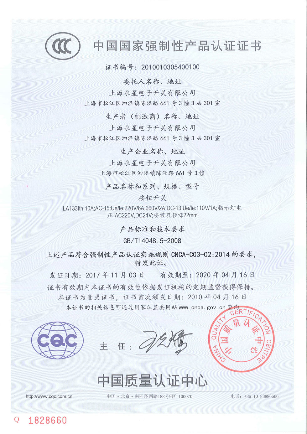 LA133按鈕開關CCC認證證書